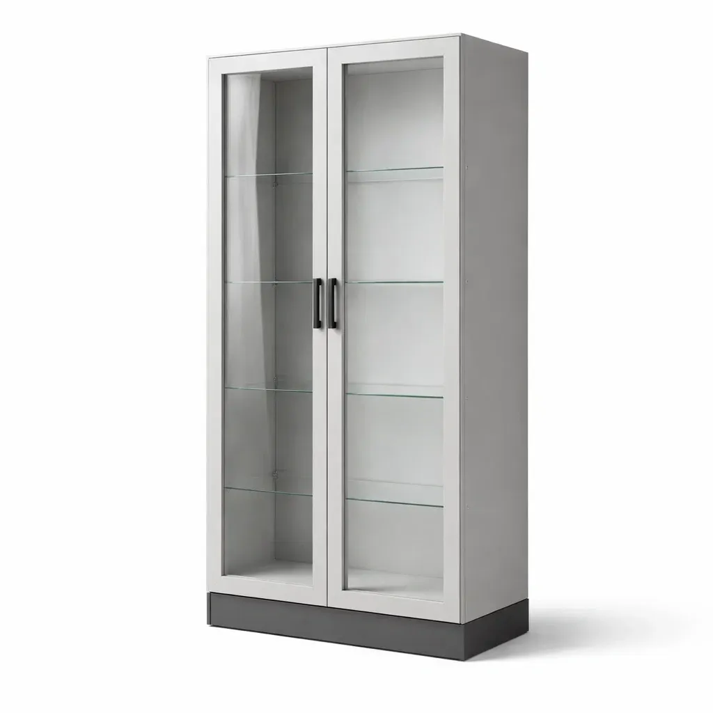 Matière : Structure en MDF, portes en acier, étagères en verre trempé 6 mm